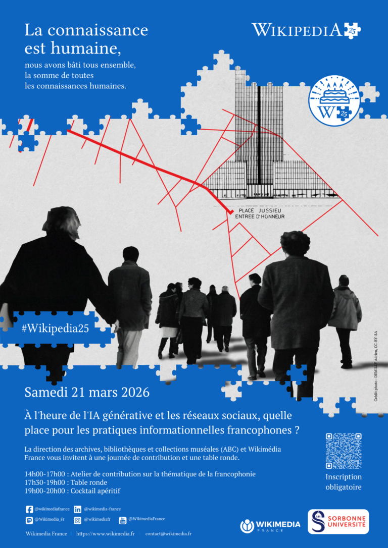 À l’occasion de la Semaine de la Francophonie, Wikimédia France et Sorbonne Université avec la direction des Archives, Bibliothèques et Collections muséales (ABC) organisent le samedi 21 mars 2026, sur le site de Jussieu, une journée d’action et de réflexion autour d’un enjeu majeur : la place des contenus francophones dans l’écosystème numérique à l’heure de l’intelligence artificielle générative.