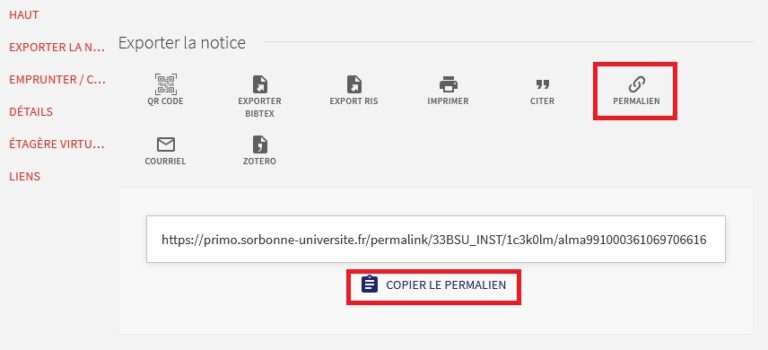 Cliquez sur « Permalien » et « copier le permalien » dans la zone « Je souhaite réserver des ouvrages pour ma contribution » dans formulaire d’inscription ci-dessous, accompagné du nom de l’auteur et du titre de l’ouvrage.