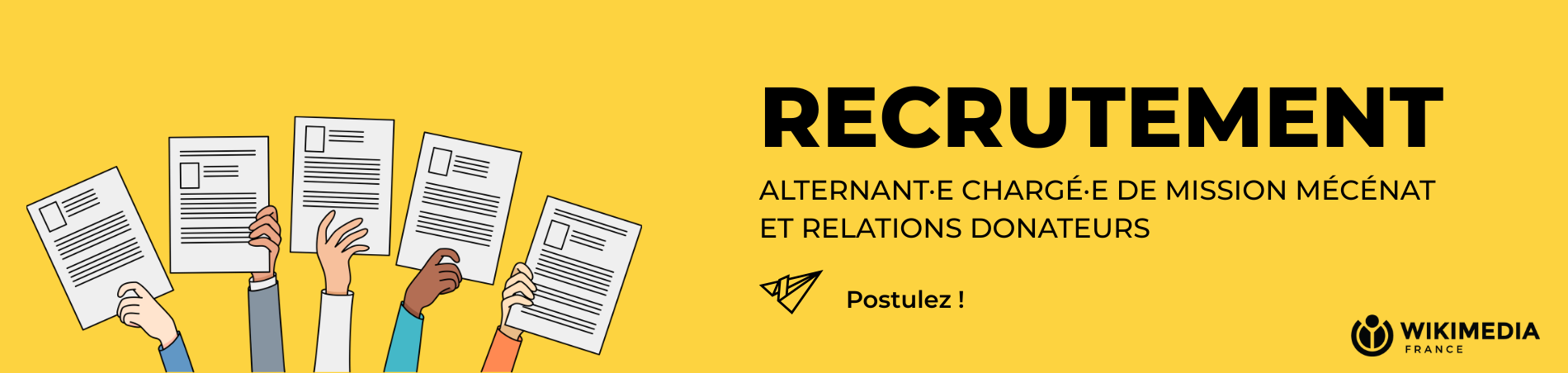 Wikimédia France encourage la diversité dans ses recrutements. À compétences égales, Wikimédia France étudie les candidatures des femmes, des hommes et des personnes non binaires de manière équitable.