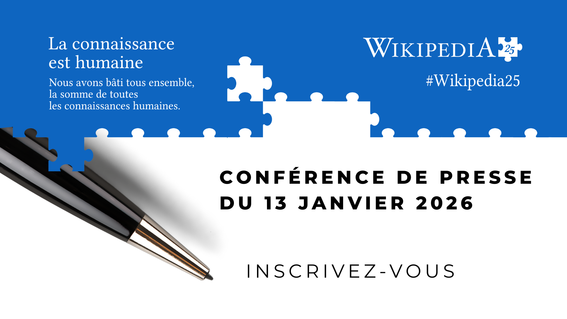 Pour participer à la conférence de presse du 13 janvier 2026, merci de vous inscrire dans le formulaire ci-dessous. Veuillez indiquer si vous participerez au cocktail apéritif. Informations personnelles Prénom* : Nom* : Votre e-mail* : Informations professionnelles Je représente un média NonOui Structure représentée : Nom du média : Type de support : Confirmation d'inscription En cochant cette case, je confirme m’inscrire à la conférence de presse (16h30-17h30). En cochant cette case, je confirme m’inscrire au cocktail apéritif convivial (17h30-20h00). Données personnelles En cochant cette case, j'accepte que Wikimédia France traite et conserve mes données personnelles le temps de l'organisation de l'évènement, ainsi que la politique confidentialite et les mentions legales. Δ