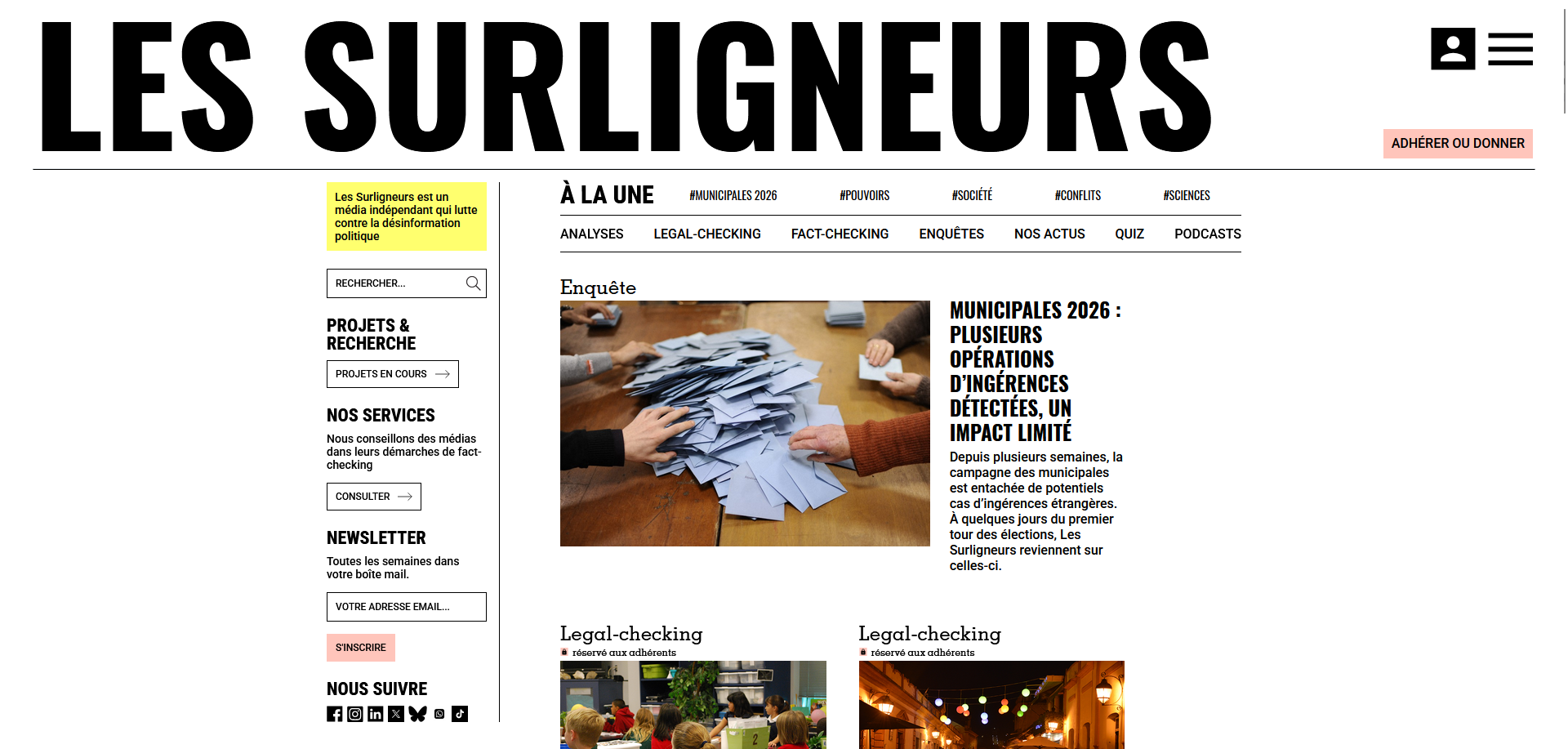 Le travail de patrouille sur Wikipédia repose sur la vérifiabilité. Or, la désinformation politique emprunte souvent le canal du droit pour asseoir sa crédibilité. Fondé en 2017, le média indépendant Les Surligneurs réunit journalistes et enseignants-chercheurs en droit pour passer les discours publics au crible des textes législatifs.